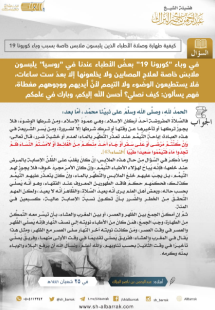 فتوى أجاب عنها فضيلة الشيخ عبد الرحمن بن ناصر البراك - أثابه الله -، عن كيفية طهارة وصلاة الأطباء الذين يلبسون ملابس خاصة بسبب وباء كورونا لمدة 6 ساعات ولا يخلعونها بسبب العدوى.