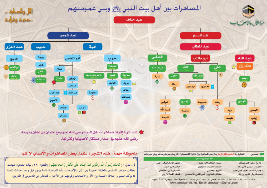 بوستر يحتوي على رسم توضيحي يبين المصاهرات من أبناء هاشم بن عبد مناف وأبناء عبد شمس بن عبد مناف، وتوضح الشجرة أن المصاهرة قائمة بينهم قبل وبعد أحداث الفتنة، مما يؤكد استمرار العلاقة الحميمة بين الآل والأصحاب وذريتهم عبر الأجيال.