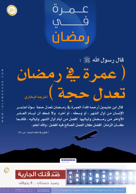 بوستر يبين فضل العمرة في شهر رمضان وأنها تعدل حجة، مع تعليق مختصر للشيخ ابن عثيمين - رحمه الله -.
