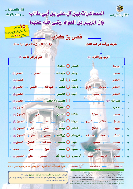 بوستر يحتوي على رسم توضيحي يبين المصاهرات بين آل علي بن أبي طالب وآل الزبير بن العوام - رضي الله عنهما - مما يؤكد العلاقة الحميمة بين الآل والأصحاب وذريتهم عبر الأجيال.