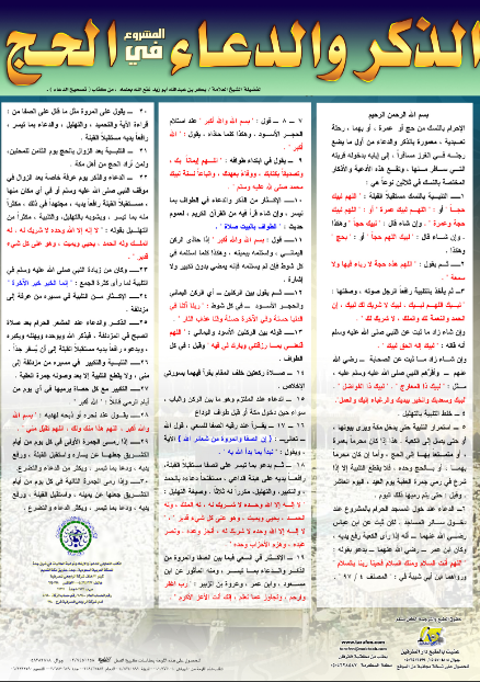 الإحرام بنسك من حج أو عمرة، أو بهما، رحلة تعبدية معمورة بالذكر والدعاء، وهذا بوستر يحتوي على الأذكار والأدعية المشروعة في الحج، مقتبسة من كتاب تصحيح الدعاء للشيخ بكر أبو زيد - رحمه الله -.