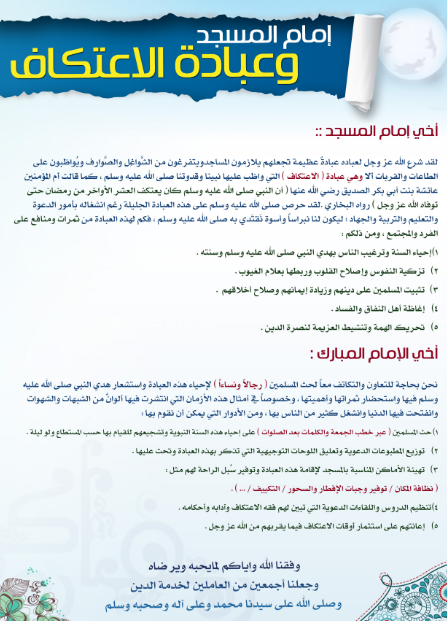 بوستر يحتوي على بعض ثمرات ومنافع الاعتكاف على الفرد والمجتمع، مع بعض النصائح والتوجيهات للأئمة لحث المسلمين على إحياء هذه العبادة.