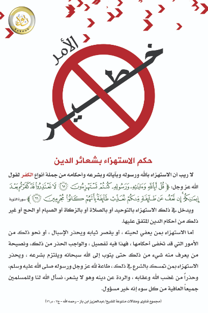 بوستر يحتوي على فتوى للشيخ ابن عثيمين - رحمه الله - بين فيها حكم الاستهزاء بشعائر الدين.
