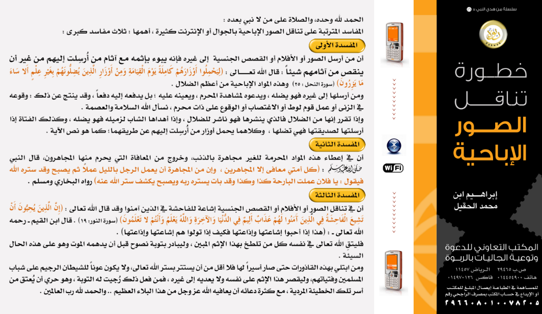 بوستر يبين بعض المفاسد المترتبة على تناقل الصور الإباحية بالجوال أو الإنترنت، ومنها أن من أرسلها يبوء بإثمه مع آثام من أرسلت إليهم من غير أن ينقص من آثامهم شيئًا.