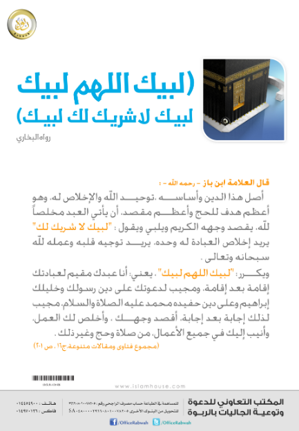 بوستر يحتوي على تعليق مختصر للشيخ ابن باز - رحمه الله - على معنى: لبيك اللهم لبيك .. لبيك لا شريك لك لبيك.