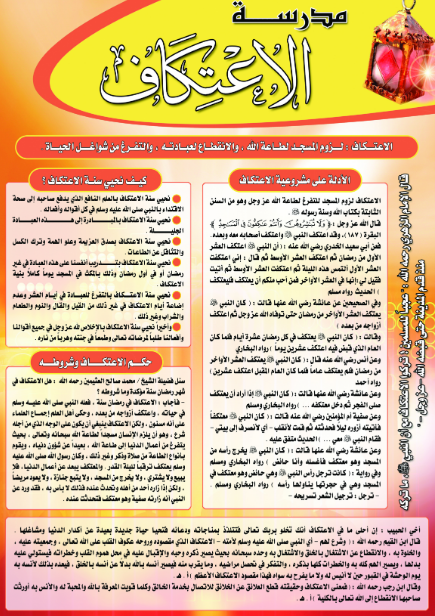 بوستر يحتوي على معنى الاعتكاف، والأدلة على مشروعيته، وحكم الاعتكاف وشروطه، وكيف نحيي سنة الاعتكاف.