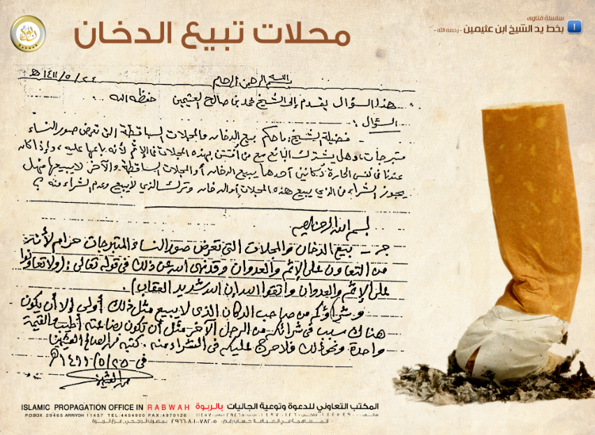 بوستر يحتوي على فتوى بخط الشيخ ابن عثيمين - رحمه الله - وكان نص سؤالها: «ما حكم بيع الدخان والمجلات الساقطة التي تعرض صور النساء متبرجات؟ وهل يشترك البائع مع من أفتتن بهذه المجلات في الإثم؛ لأنه باعها عليه، وإذا كان عندنا في نفس الحارة دكانَيْن: أحدهما يبيع الدخان أو المجلات الساقطة، والآخر لا يبيعها: فهل يجوز الشراء من الذي يبيع هذه المجلات أو الدخان، وترك الذي لا يبيع وعدم الشراء منه».