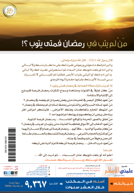 اعلم أنه لو بلغت ذنوبك عنان السماء .. ثم تبت إلى الله .. تقبل الله توبتك، وها هو شهر رمضان فرصة لك؛ فإذا لم تتب في رمضان، فمتى تتوب؟