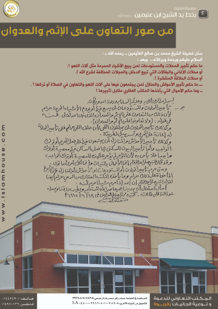 بوستر يحتوي على سؤال أجاب عنه الشيخ ابن عثيمين - رحمه الله - بخطه، ونصه: «ما حكم تأجير المحلات والمستودعات لمن يبيع الأشياء المحرمة مثل ألات اللهو أو محلات الأغانى أو البقالات التى تبيع الدخان؟».