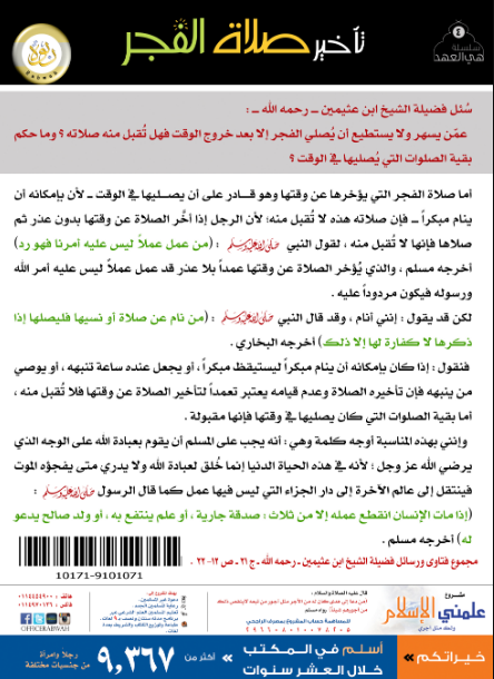 بوستر يحتوي على سؤال أجاب عنه الشيخ ابن عثيمين - رحمه الله - ونصه: {عمن يسهر ولا يستطيع أن يصلي الفجر إلا بعد خروج الوقت فهل تقبل منه؟ وحكم بقية الصلوات التي يصليها في الوقت؟}.