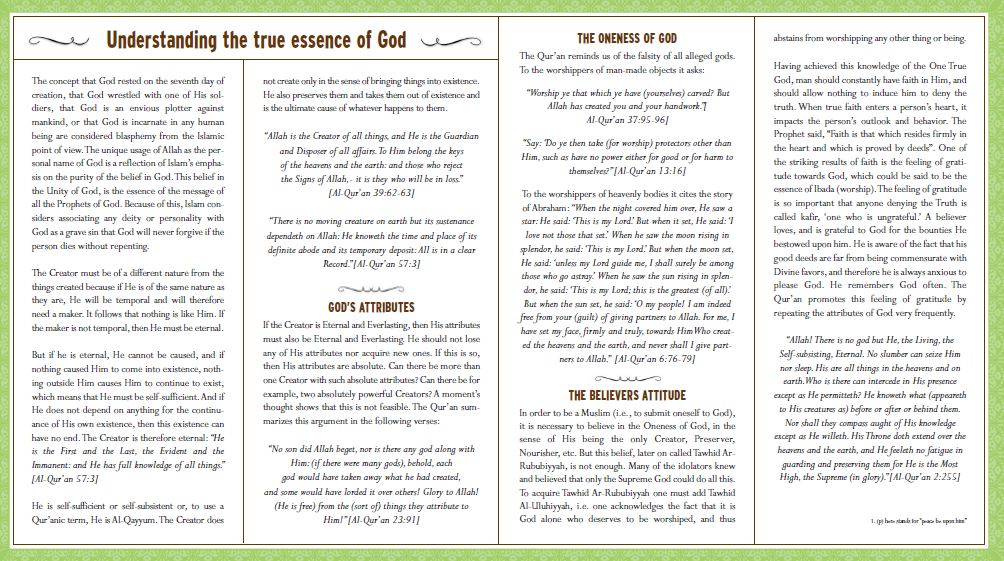 This pamphlet talks about the concept of God in Islam through some points as; God alone is worthy of worship, God is directly worshipped, all prophets called to the worship of God and the purpose of life is to worship God. It also answers two important questions: Is there a god and who is god?