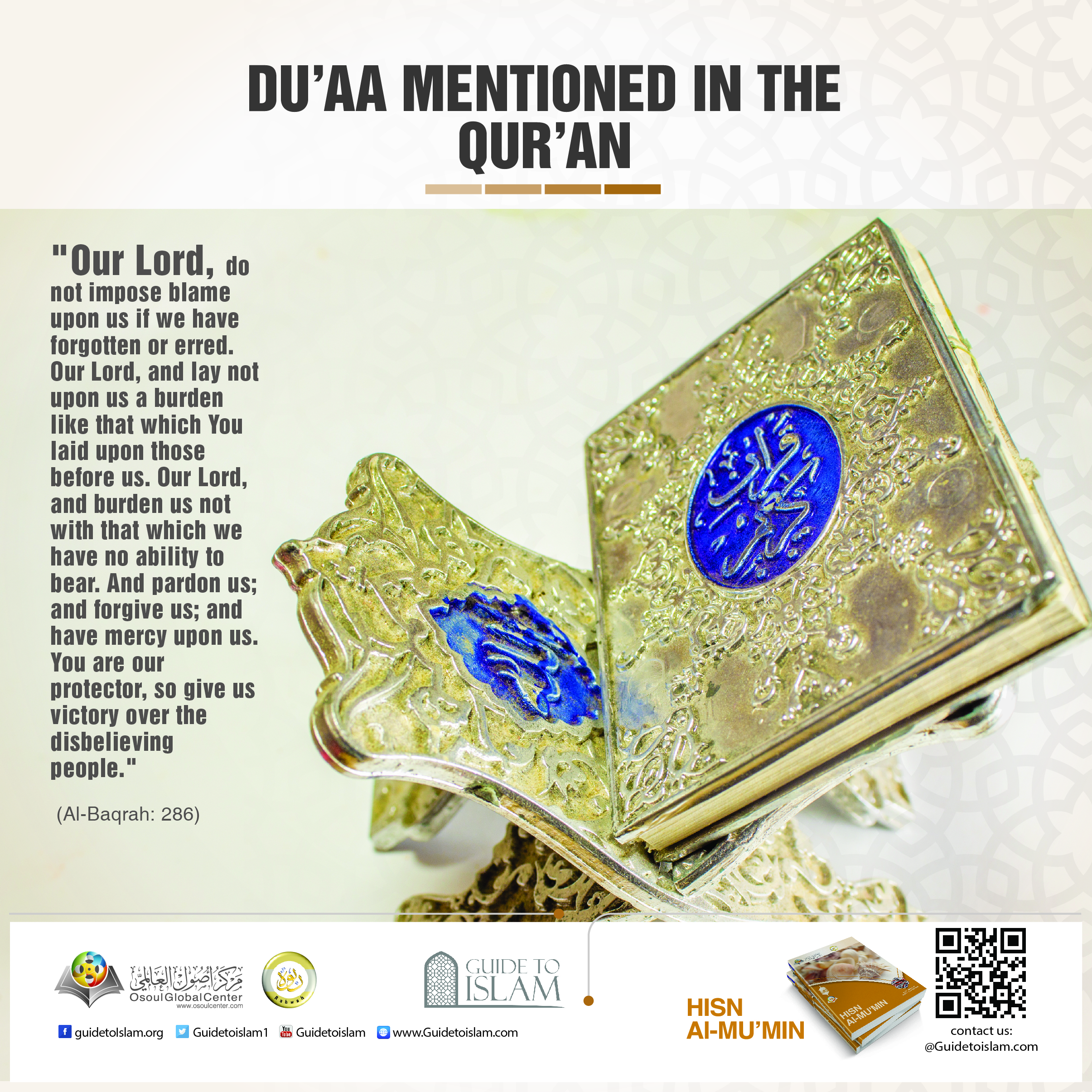 "Our Lord, do not impose blame upon us if we have forgotten or erred. Our Lord, and lay not upon us a burden like that which You laid upon those before us. Our Lord, and burden us not with that which we have no ability to bear. And pardon us; and forgive us; and have mercy upon us. You are our protector, so give us victory over the disbelieving people."