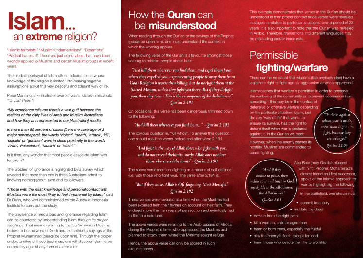 This pamphlet shows the Islamic view to terrorism and how some Quranic verses are misunderstood by lots of people. It also shows when war is permissible Islam.
