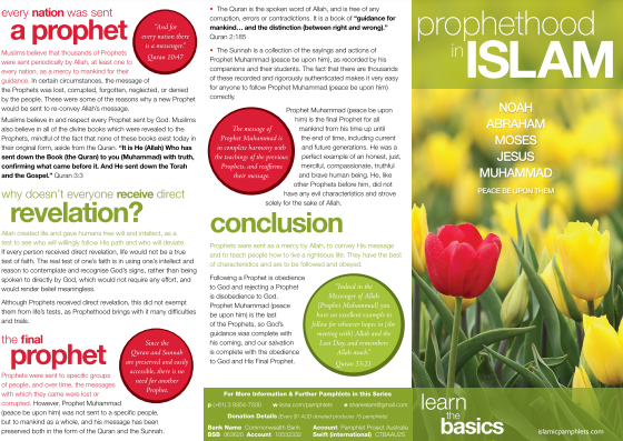 This pamphlet talks about the principle of prophethood. It also shows that the message to all prophets was one regarding that Allah is one and that he deserves to be worshipped alone. It shows that all prophets had miracles to prove their prophethood.