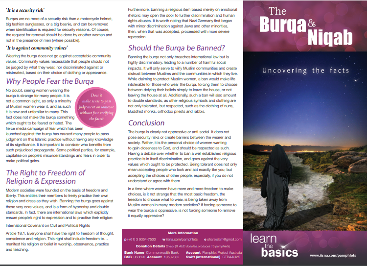 This pamphlet discusses the issue of the burqu and niqab through some points as: Why people fear the burqu, the right to freedom of religion and expression and types of Islamic dresses. It also refutes some misconceptions about niqab and burqu.