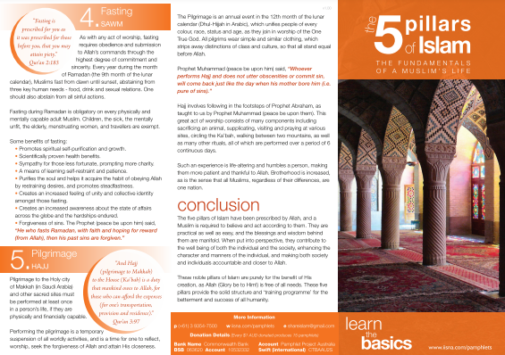 This pamphlet handles the issue of the five pillars of Islam: declaration of faith, prayer, zakat, fasting and hajj. It explains them in a simple and easy way.