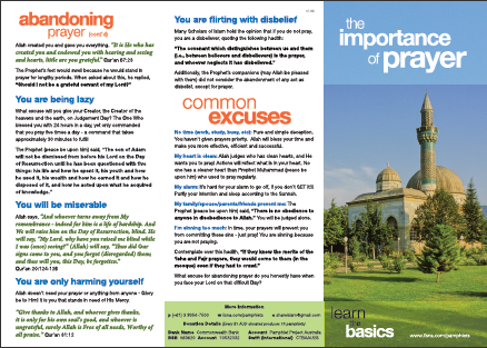 This pamphlet handles the issue of prayer through some points: its importance, its benefits, being a pillar of Islam, harms that stemmed from abandoning it, common excuses that some people mention.