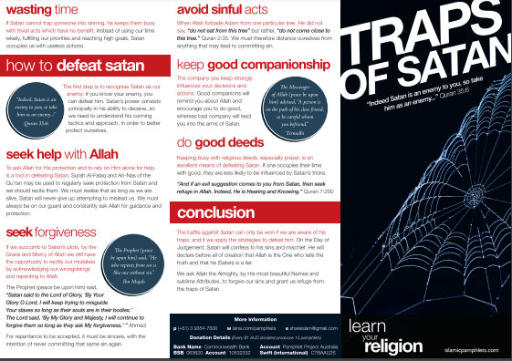 This pamphlet talks about Satan through some points: his traps such as disbelief in the oneness of Allah, innovation in the religion, beautifying evil deeds and arousing desires. Finally, it talks about how to defeat him.