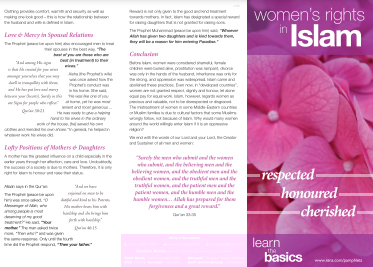 This pamphlet talks about women’s right in Islam such as equal right to knowledge and equal right to choose a spouse. It also shows that the principle of reward and accountability is equal for man and woman in Islam.