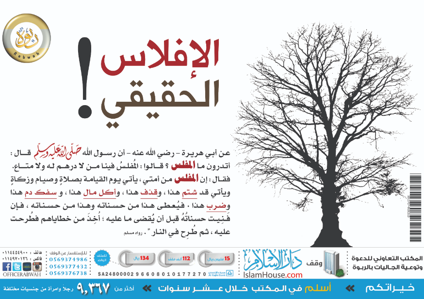 بوستر يبين أن الإفلاس الحقيقي هو من يأتي يوم القيامة بصلاته وصيامه، ويأتي قد شتم هذا، وقذف هذا، وأكل مال هذا، وسفك دم هذا، وضرب هذا، فيقتص لهذا من حسناته، ولهذا من حسناته، فإذا فنيت حسناته قبل أن يقضي ما عليه، أخذ من خطاياهم فطرحت عليه ثم طرح في النار.