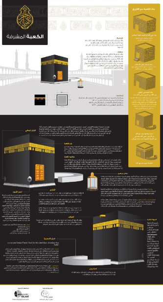 إنفوجراف يحتوي على معلومات عن الكعبة المشرفة، ومنها: بناء الكعبة، أبعادها، كسوة الكعبة، الحجر الأسود، الملتزم، الحطيم، مقام إبراهيم - عليه السلام -.