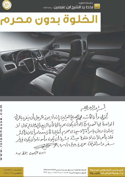 في هذا التصميم يبين الشيخ ابن عثيمين - رحمه الله - بخط يده حكم الخلوة بالمرأة الأجنبية في السيارة بدون محرم.
