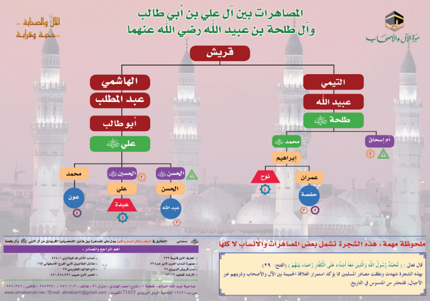 بوستر يحتوي على رسم توضيحي يبين المصاهرات بين آل علي بن أبي طالب وآل طلحة بن عبيد الله - رضي الله عنهما - مما يؤكد العلاقة الحميمة بين الآل والأصحاب وذريتهم عبر الأجيال.