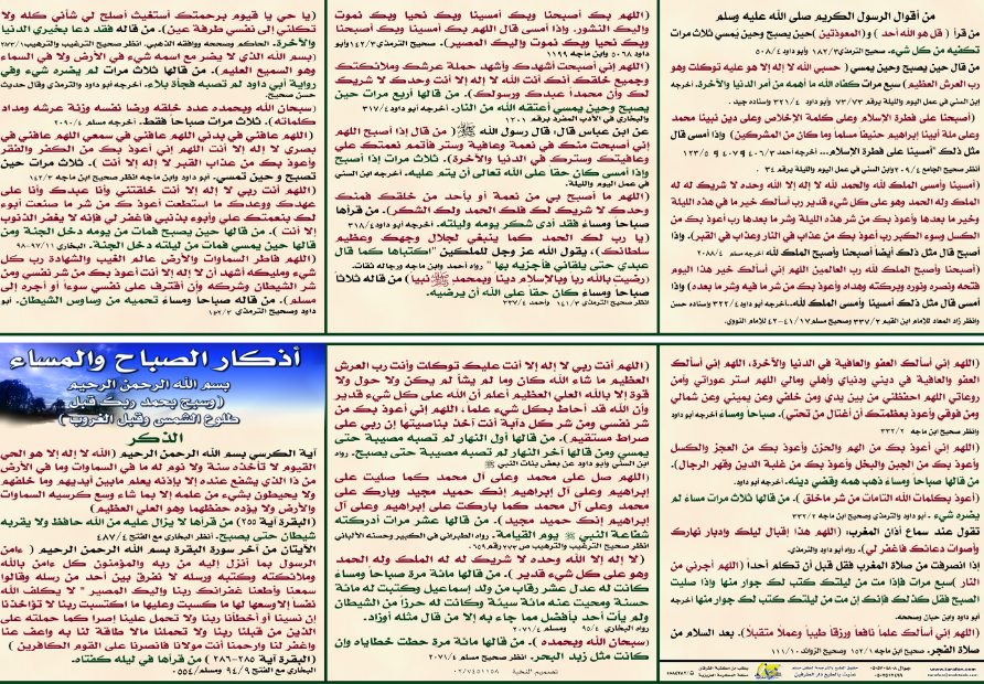 أذكار الصباح والمساء : عدة بوسترات متميزة تحتوي على أذكار الصباح والمساء، ومنها بوستر يحتوي على مقارنة للأذكار الواردة في عدة كتب، ومنها: حصن المسلم.