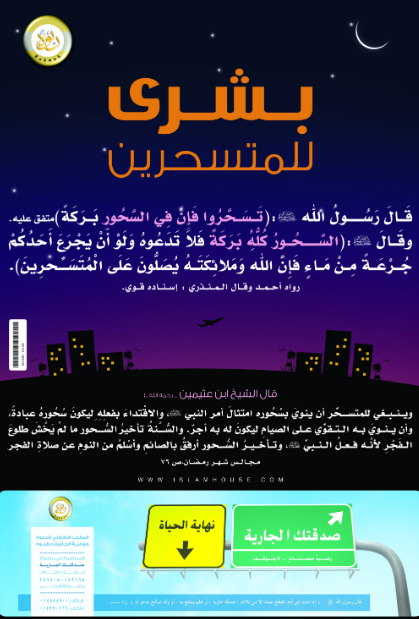 بوستر يحتوي على حديثين في فضل السحور، مع تعليق مختصر للشيخ ابن عثيمين - رحمه الله -.