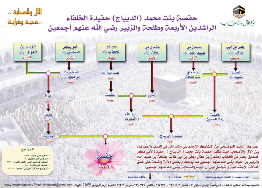 بوستر يحتوي على رسم توضيحي يعبر عن التشابك الإجتماعي والتداخل في النسب والمصاهرة بين الآل والأصحاب؛ حيث تظهر حفصة بنت محمد الديباج؛ حفيدة لأبي بكر الصديق، وعمر بن الخطاب، وعثمان بن عفان، وعلي بن أبي طالب، وطلحة بن عبيد الله، والزبير بن العوام - رضي الله عنهم أجمعين - مما يؤكد ويعطي دلالة واضحة على عمق العلاقة الاجتماعية والتواصل بين آل البيت والصحابة - رضي الله عنهم أجمعين -.