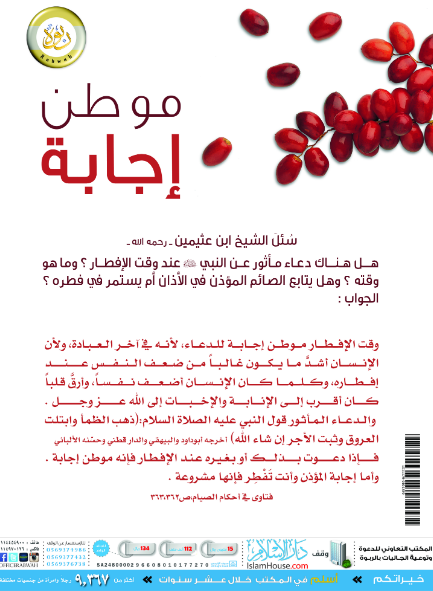 بوستر يحتوي على فتوى للشيخ ابن عثيمين - رحمه الله - ونص السؤال: «هل هناك دعاء مأثور عن النبي - صلى الله عليه وسلم - عند وقت الإفطار؟ وما هو وقته؟ وهل يتابع الصائم المؤذن في الأذان أم يستمر في فطره؟»