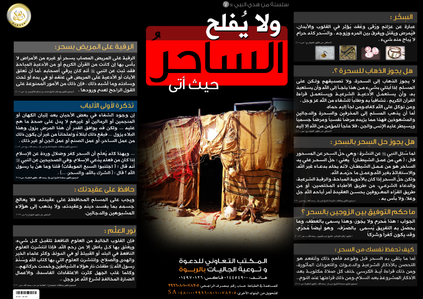 بوستر يبين حكم السحر، وحكم من يذهب للسحرة، وحكم حل السحر بالسحر وغيرها من المسائل المهمة المتعلقة بهذا الأمر.