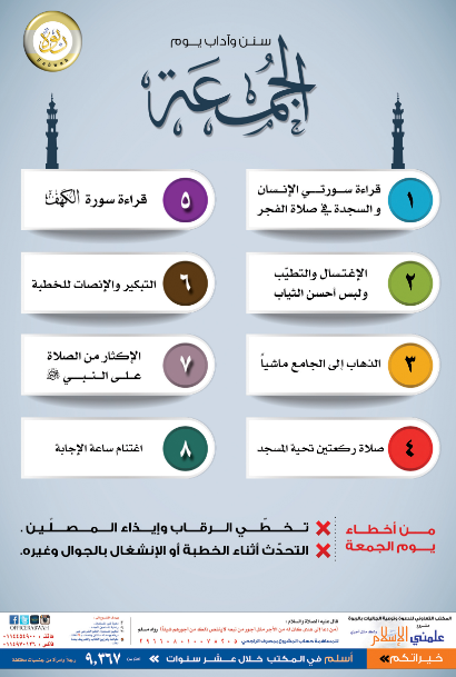 بوستر يبين بعض سنن وآداب يوم الجمعة، مع بيان بعض الأخطاء التي يقع فيها البعض.