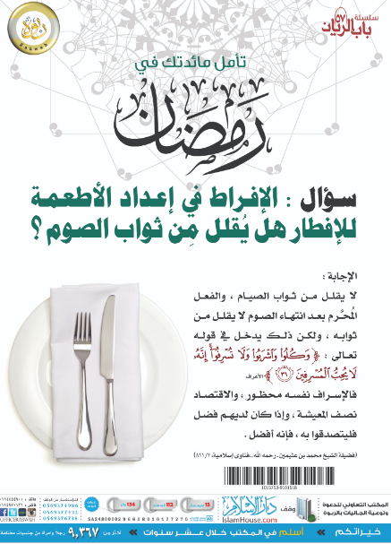 بوستر يحتوي على سؤال أجاب عنه الشيخ ابن عثيمين - رحمه الله - ونصه: «الإفراط في إعداد الأطعمة للإفطار هل يقلل من ثواب الصوم؟».