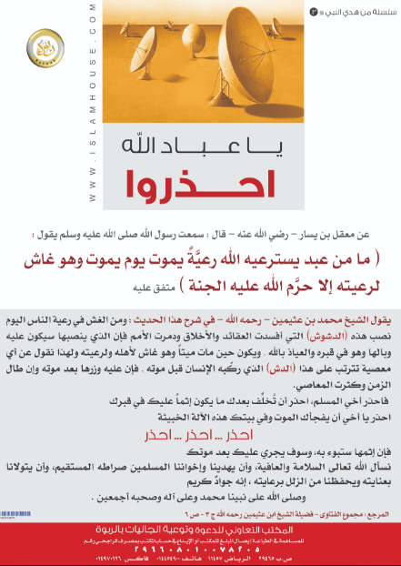 بوستر يحتوي على كلمة للشيخ ابن عثيمين - رحمه الله - يحذر فيها من خطورة بعض القنوات الفضائية.