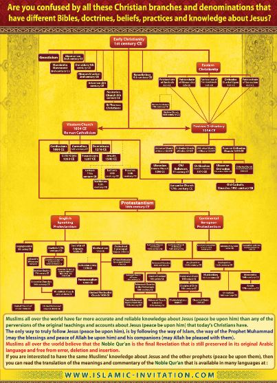 This wonderful poster shows the different Christian branch and denominations that have different Bibles, doctrines, beliefs, practices and knowledge about Jesus.