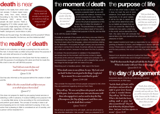 This pamphlet talks about death and hereafter in Islam. It mentions some Quranic verses about Paradise and Hell. It shows the purpose of this life and reality of death and that it is near. It also confirms the principle of reckoning on the day of judgment.