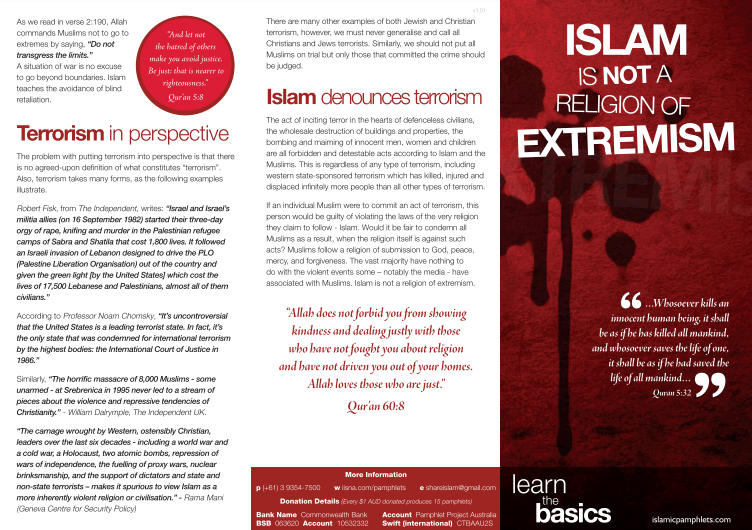 This pamphlet shows the Islamic view to terrorism and how some Quranic verses are misunderstood by lots of people. It also shows when war is permissible Islam.