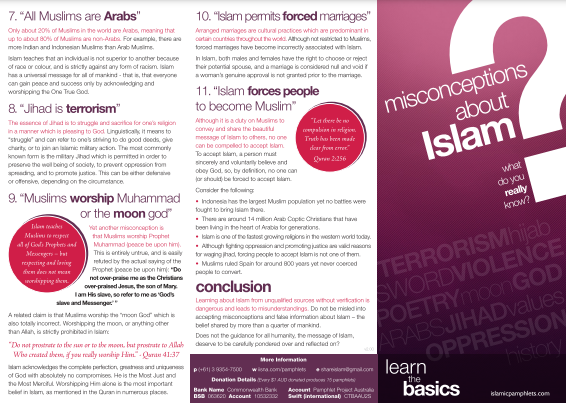 This pamphlet shows some misconceptions about Islam and gives answers to all of them. They are such as that Muslim worship a new god or they worship the Prophet Muhammad, Islam is a religion of terrorism, hijab oppresses Muslim women, Islam forces women to marry to who they do not want and that Islam forces people to be Muslims.