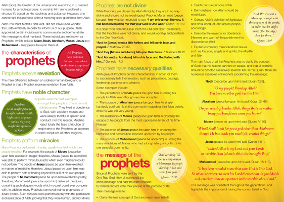 This pamphlet talks about the principle of prophethood. It also shows that the message to all prophets was one regarding that Allah is one and that he deserves to be worshipped alone. It shows that all prophets had miracles to prove their prophethood.