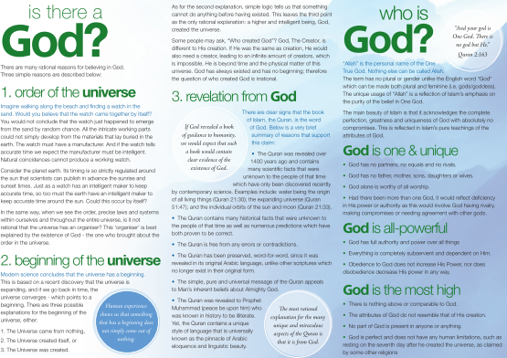 This pamphlet talks about the concept of God in Islam through some points as; God alone is worthy of worship, God is directly worshipped, all prophets called to the worship of God and the purpose of life is to worship God. It also answers two important questions: Is there a god and who is god?