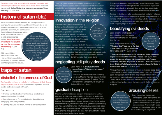 This pamphlet talks about Satan through some points: his traps such as disbelief in the oneness of Allah, innovation in the religion, beautifying evil deeds and arousing desires. Finally, it talks about how to defeat him.